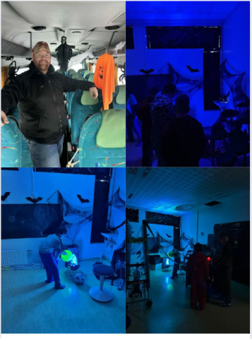 Październik był dla nas w Kotið bardzo zabawnym miesiącem. Robiliśmy ozdoby na Halloween i udekorowaliśmy Kotið strasznymi dekoracjami. 31 października mieliśmy szczególnie wesoły dzień — jedno z naszych pomieszczeń zamieniliśmy w coś w rodzaju domu strachów. Ævar, nasz kierowca autobusu, przywiózł większość dzieci do Kotið autobusem, który sam ozdobił w stylu halloweenowym. Dzieci przyszły w wspaniałych kostiumach, a potem otworzyliśmy pomieszczenie, w którym w domu strachów grała upiorna muzyka. Następnie dzieci dostały torby ze słodyczami i wszyscy razem świetnie się bawiliśmy w Kotið.