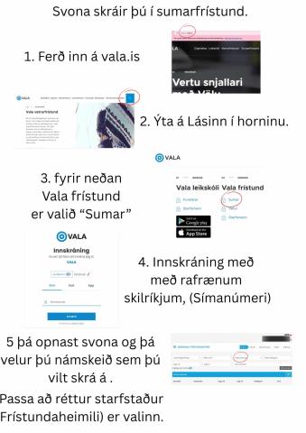 Fyrirkomulagið er þannig að börnin eru skráð hverja viku fyrir sig. Það er einungis hægt að skrá á 5 daga námskeið með vistun allan daginn, eða 4 daga námskeið með vistun allan daginn í þeim vikum sem lögbundnir frídagar falla á.